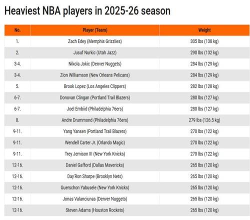 在这份榜单中,灰熊的扎克·埃迪以138公斤排名联盟第一,爵士的努尔基奇132公斤紧随其后。减重后的锡安与约基奇都是129公斤,并列排名第三。快船的大洛、开拓者的克林根、76人的恩比德和德拉蒙德分列第4到第8位。
