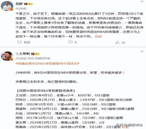 中国球员杨瀚森登场5分钟,得到2分1篮板,至此,结束了个人的首次NBA常规赛之旅。他的表现也引起了国内媒体的热议。