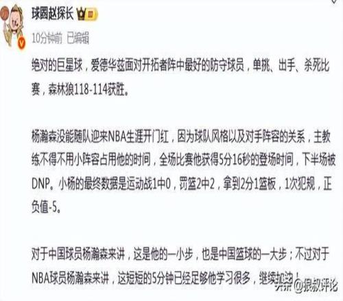媒体人赵探长发文点评:杨瀚森没能随队迎来NBA生涯开门红,因为球队风格以及对手阵容的关系,主教练不得不用小阵容占用他的时间,全场比赛他获得5分16秒的登场时间,下半场被DNP。小杨的最终数据是运动战1中0,罚篮2中2,拿到2分1篮板,1次犯规,正负值-5。