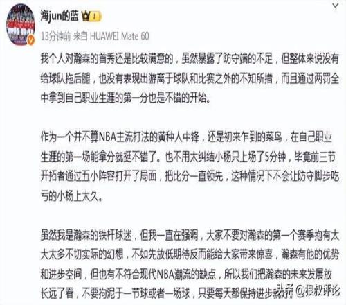 媒体人“海jun的蓝”发文点评:我个人对瀚森的首秀还是比较满意的,虽然暴露了防守端的不足,但整体来说没有给球队拖后腿,也没有表现出游离于球队和比赛之外的不知所措,而且通过两罚全中拿到自己职业生涯的第一分也是不错的开始。