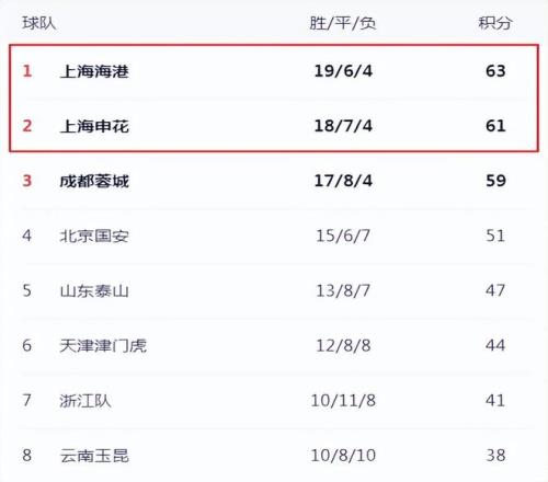 原本排名第三的上海申花1-0小胜深圳新鹏城,将冠军悬念保留到了最后一轮。本场比赛仅进行了2分钟,申花便取得了领先,路易斯头球攻破深圳球门。不过,随后的比赛并不像申花想象的那么容易,虽然他们全场共完成了18次射门,但始终没能第二次洞穿对手的球门。比赛最终以1-0结束。申花取胜后积分反超蓉城,61分与海港差2分,保留末轮逆袭的希望。