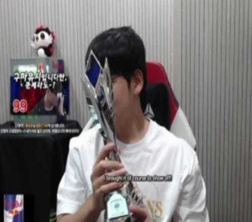 电竞体育11月10报道 Gumayusi在直播间向粉丝们多角度展示FMVP奖杯;