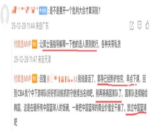 付政浩在和网友互动时直言:“又开启了新一轮装模做样的CBA球员考察”,并且一针见血指出:“郭导已经黔驴技穷,早点下课,回到CBA找个中下游球队好好抓训练抓防守继续当名帅吧。别再祸祸国家队了,国家队连续输给韩国,这是在砸所有中国篮球人的饭碗,一举把中国篮球的商业价值全干崩了。放过中国篮球吧。