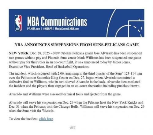 在太阳123-114赛季三杀鹈鹕的比赛,阿尔瓦拉多与马威在第三节末段爆发冲突互殴。如今根据名记Shams报道,NBA宣布阿尔瓦拉多禁赛2场与损失8万美元,马威禁赛1场与损失6万美元。