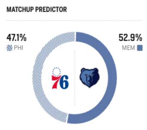 截止到目前,76人仅以16胜14负的战绩,惨遭3连败,排名下降至东部第七。作为对比,灰熊队则以15胜17负的战绩,排名从曾经的西部垫底升至第九位。赛前,美媒ESPN对本场比赛进行了胜率预测,76人胜率仅有47.1%,略占下风,灰熊胜率则为52.9%。