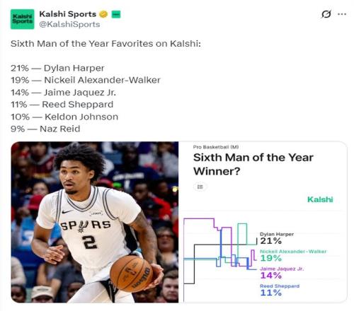 目前谢泼德排在联盟最佳第六人排行榜的第四位,目前他的超六概率11%。