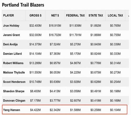 2025-26赛季为杨瀚森的新秀赛季,本赛季合同薪资为442.236万美元,据统计,杨瀚森需要交158.8万的美国联邦政府税、25.8万的州税、10.4万的地方政府税、1.7万的运动员税及个人养老保险扣除等,最终到手工资约为234.2万美元。
