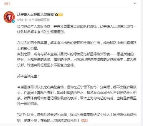 1月9日,辽宁铁人官宣,队长邦本宜裕离队。值得一提的是,此前延边龙鼎俱乐部先官宣了邦本宜裕加盟。辽宁铁人俱乐部表示:经与球员本人友好协商,并充分尊重其经纪团队的选择,与一线队球员邦本宜裕先生郑重道别。“我们的队长,感谢你将最好的年华、洋溢的青春奉献给辽宁铁人!唯祝愿你前路光明,步履不停,在新的天地继续绽放光芒!”