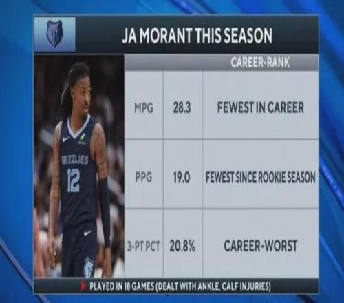 本赛季至今,莫兰特仅仅出战灰熊38场(16-22,西部第十)比赛中的18场,场均上阵28.3分钟,得到19分3.2板7.6助3.6失误1断,三项命中率40.1%、20.8%和90%,场均得分自菜鸟赛季以来的新低,且之前与教练组发生冲突。
