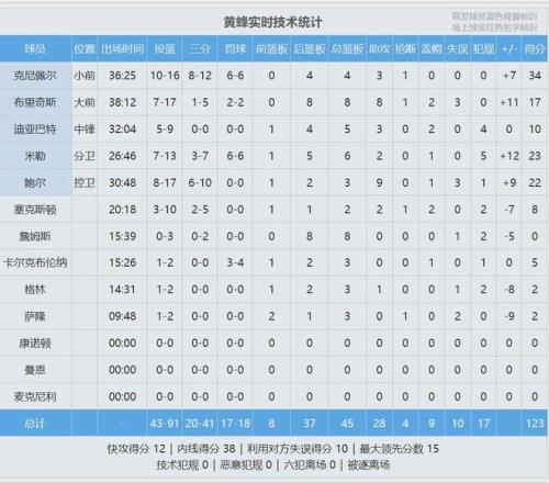 克尼佩尔前9次三分出手进了8个,让人看到了巅峰克莱的影子。让人意外的是,黄蜂赛后发布的获胜海报,居然只有三球一个人。此役三球17中8,得到22分3板9助3失误。米勒13中7,砍下23分6板2助。最近7场,黄蜂6胜1负。