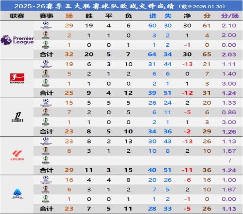 在胜场、胜率、进球、失球、场均得分方面,英超球队毫无悬念地一马当先,这一点其实大家早有预期。不过垫底的居然是西甲,这应该出乎很多人的意料。反而是印象中唯唯诺诺毫无亮点的意甲球队,竟然还能排在第三。
