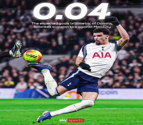 在今天凌晨进行的英超第24轮比赛中,热刺主场2-2战平曼城,其中索兰克在第70分钟打进了一记蝎子摆尾进球,帮助球队将比分扳平为2-2。