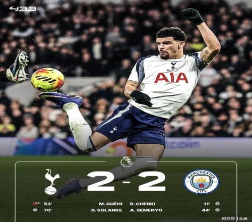 曼城客场2-2战平热刺,6轮仅1胜积47分位居第2,距榜首阿森纳6分。热刺联赛6轮不胜,积29分名列第14。谢尔基首开纪录,塞梅尼奥扩大比分,哈兰德和B席助攻,索兰克双响+蝎子摆尾扳平。