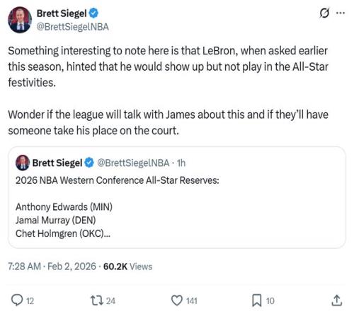 只不过,美媒ClutchPoints名记Brett Siegel跟进表示,詹姆斯虽然以替补身份入选,但不意味着他一定会出战。