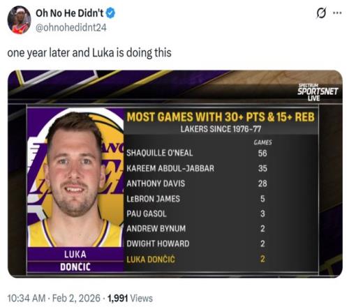 凭借这样的表现,东契奇湖人生涯第二次单场交出至少30分15板,成功追平拜纳姆与霍华德并列队史第六,奥尼尔56次第一、贾巴尔35次第二、浓眉哥28次第三、詹姆斯5次第四、大加索尔3次第五。