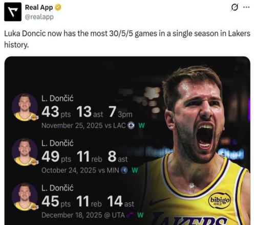 同时这是东契奇本赛季第27次单场交出至少30+5+5,超越65-66赛季的杰里-韦斯特创造新的湖人队史纪录。