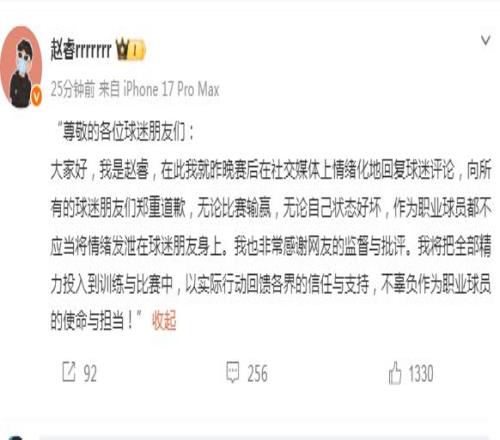 大家好,我是赵睿。在此我就昨晚赛后在社交媒体上,情绪化地回复球迷评论,向所有球迷朋友们郑重道歉。
