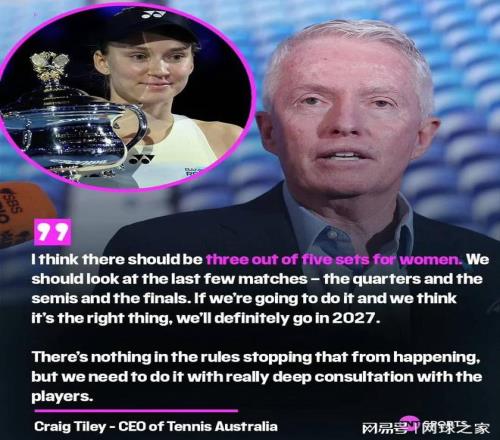2026年澳大利亚网球公开赛硝烟方散,一项可能改变女子网球历史的提议已浮出水面。澳网赛事总监泰利近日公开表示,正在考虑从2027年开始,将女子单打比赛后期阶段改为与男子相同的五盘三胜制。这一变革若成现实,将终结女子网球自1901年以来在大满贯赛事中统一采用三盘两胜制的传统。