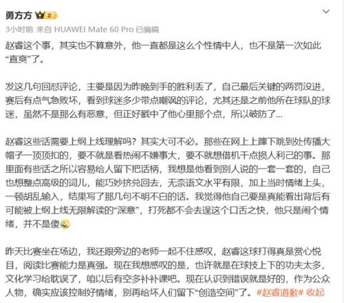 公开道歉一出,不少北京的媒体人也纷纷为赵睿说好话,洗脱罪名,勇方方表示:赵睿是性情中人,语文水平有限,输球闹情绪逞口舌之快,结果写几句不明不白的话,网友也大可不必上纲上线,扣帽子。