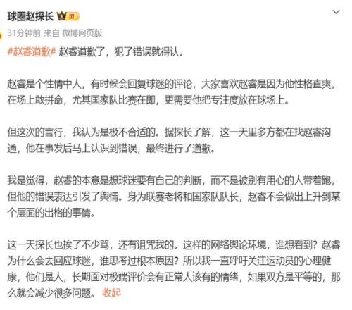 赵睿这波争议言论影响非常恶劣,伤害了新疆球迷,2月2日晚,意识到事件严重性的赵睿,在个人社媒上发表了公开致歉,表示:“向所有的球迷朋友们郑重道歉,无论比赛输赢,无论自己状态好坏,作为职业球员都不应当将情绪发泄在球迷朋友身上”。