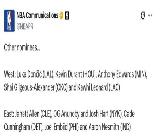 西部:东契奇(湖人)、杜兰特(火箭)、爱德华兹(森林狼)、亚历山大(雷霆)、莱昂纳德(快船)