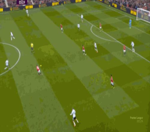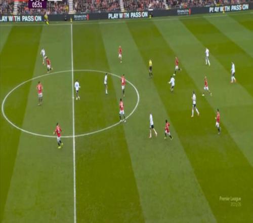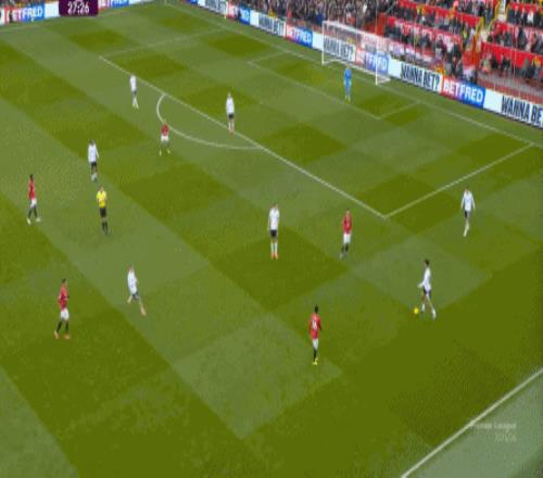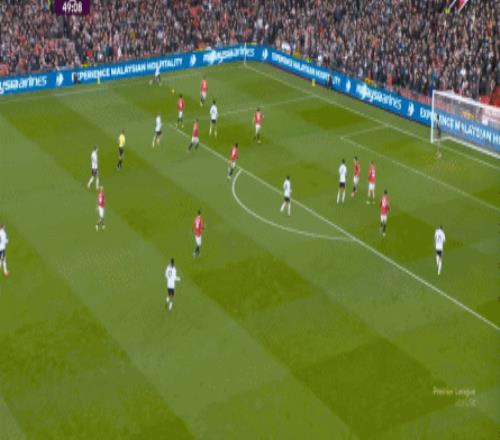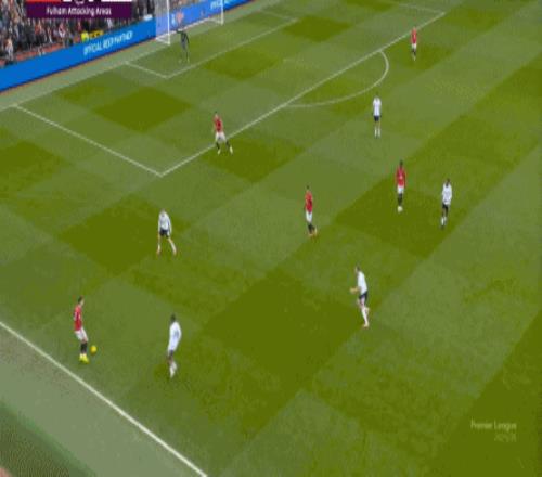 就是在这次进攻的早期阶段,曼联在场上呈现出了一个神奇的模样,那就是在富勒姆的四后卫身侧,一个曼联的球员都没有,大部分进攻手都聚在右侧打小球: