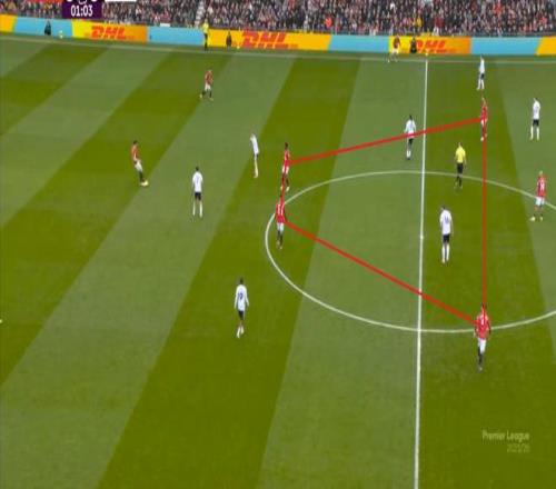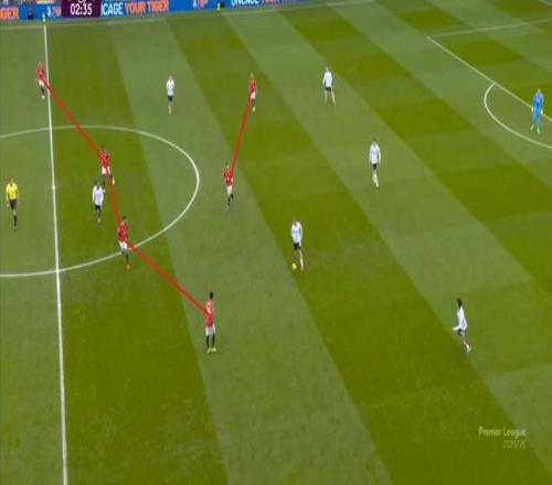 在有球的时候,本场比赛的曼联呈现出清晰的三个半形态。