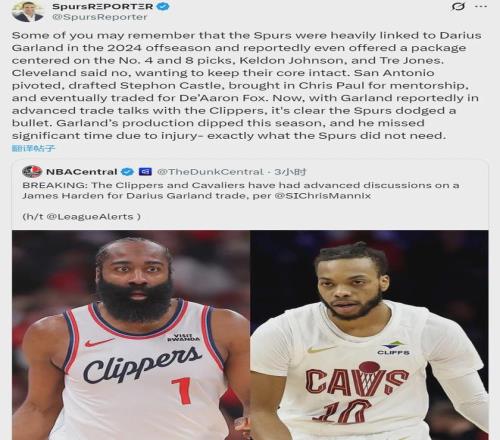 当时马刺的报价是4换1:2024年首轮4号秀(卡斯尔)和8号秀(罗伯特-迪林厄姆),外加凯尔登-约翰逊和特雷-琼斯。Dusty Garza直言:多亏骑士拒绝了这个报价,马刺逃过一劫。现在就算骑士想拿加兰单换卡斯尔,马刺都不答应了。