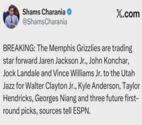 爆料王Shams:灰熊将3J+康查尔+兰代尔+小文斯-威廉姆斯送至爵士,换回李凯尔+小克莱顿+亨德里克斯+尼昂+三个首轮签。