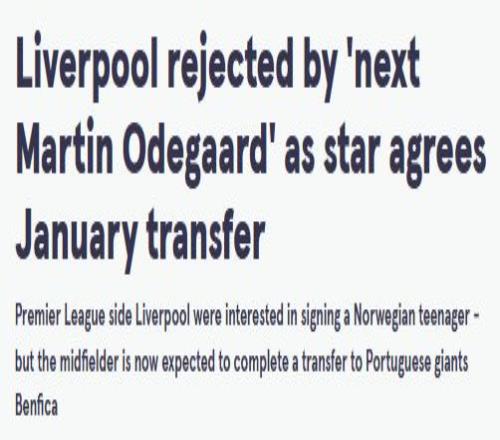 时间来到2023年,谢尔德鲁普登上更大的舞台。包括阿森纳、利物浦等英超强队均向其抛出橄榄枝。但对自己成长轨迹有清晰规划的挪威人选择了葡萄牙的本菲卡,当时媒体的报道是“利物浦被下一个厄德高拒绝了。”