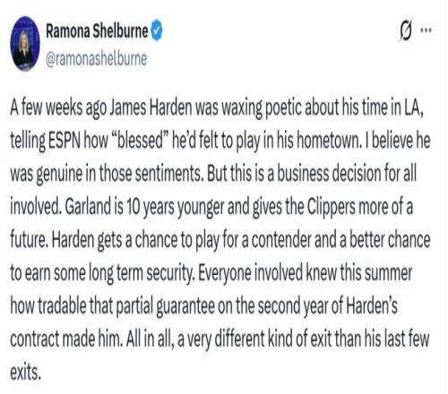 除了争冠这一固定的主线任务之外,美记Ramona Shelburne也在后续报道中指出,这一次哈登离队与此前几次不同的一点是他希望能够在骑士得到一份长期保障性续约合同。