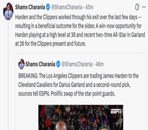 根据ESPN名记Shams报道,快船与骑士围绕加兰和哈登达成2换1交易,两人顺利完成互换,具体方案如下: