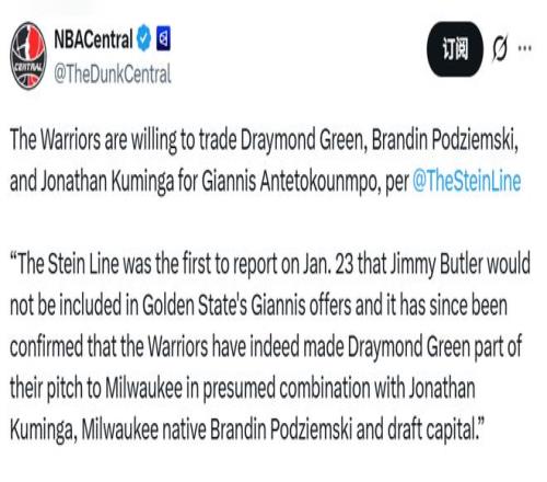 Stein表示:“1月23日我们已率先报道,吉米-巴特勒不会被纳入勇士队追逐字母哥的交易报价中。此后消息得到证实,勇士队为说服雄鹿交易,已明确将德雷蒙德-格林纳入交易方案,这份报价大概率还包含乔纳森-库明加、土生土长的威斯康星州密尔沃基人波杰姆斯基,以及若干选秀资产。”